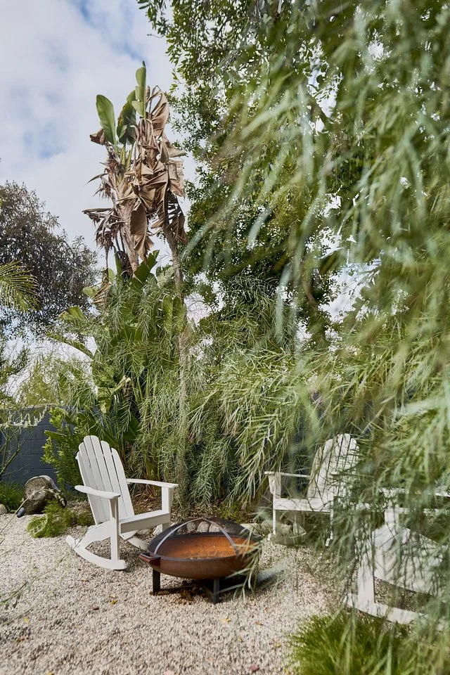 This was a small space with some interesting restraint — most notably, a miniature bocce ball-like trench in the middle of the garden. We turned the concrete pit into a stone dining patio and enclosed the entire space with a dynamic combination of plants, ranging from subtropical to native Californian. For the lawn area, we incorporated large boulders, which can be used as seats for watching the baby and eventually some fun outdoor play.